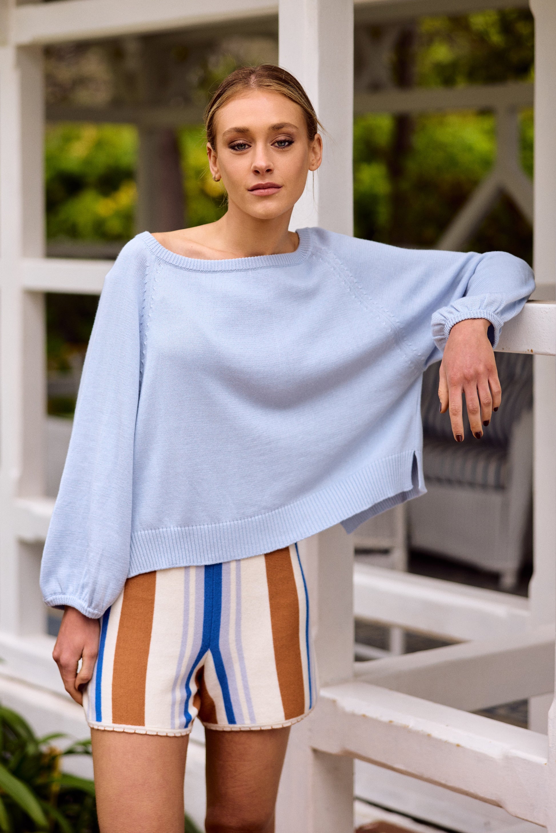 Chaleco de hilo color celeste con cuello redondo, manga 3/4 englobada y abertura en la espalda. Ligero, versátil y fácil de combinar, pensado para acompañarte en cualquier ocasión.